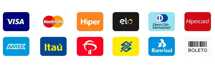 Aceitamos os cartões de crédito mais usados: Visa, Mastercard e outros. Dividimos em até 12x no cartão ou você também pode optar por pagamento por boleto bancário ou pix.